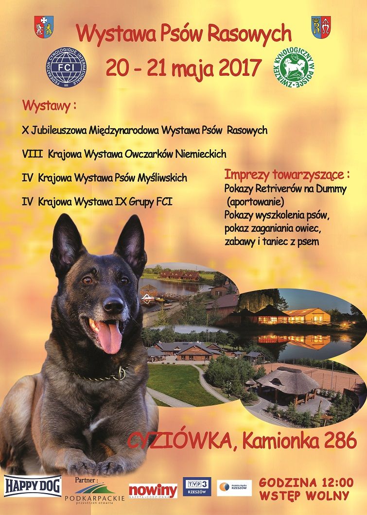 Zarząd rzeszowskiego Oddziału Związku Kynologicznego w Polsce i Komitet Organizacyjny Wystawy serdecznie zaprasza do wzięcia udziału w X Jubileuszowej Międzynarodowej Wystawie Psów Rasowych / CACIB / w dniach 20-21 maja 2017r., która odbędzie się w Ośrodku Szkoleniowo– Wypoczynkowym FOLWARK – CYZIÓWKA, Kamionka 286.