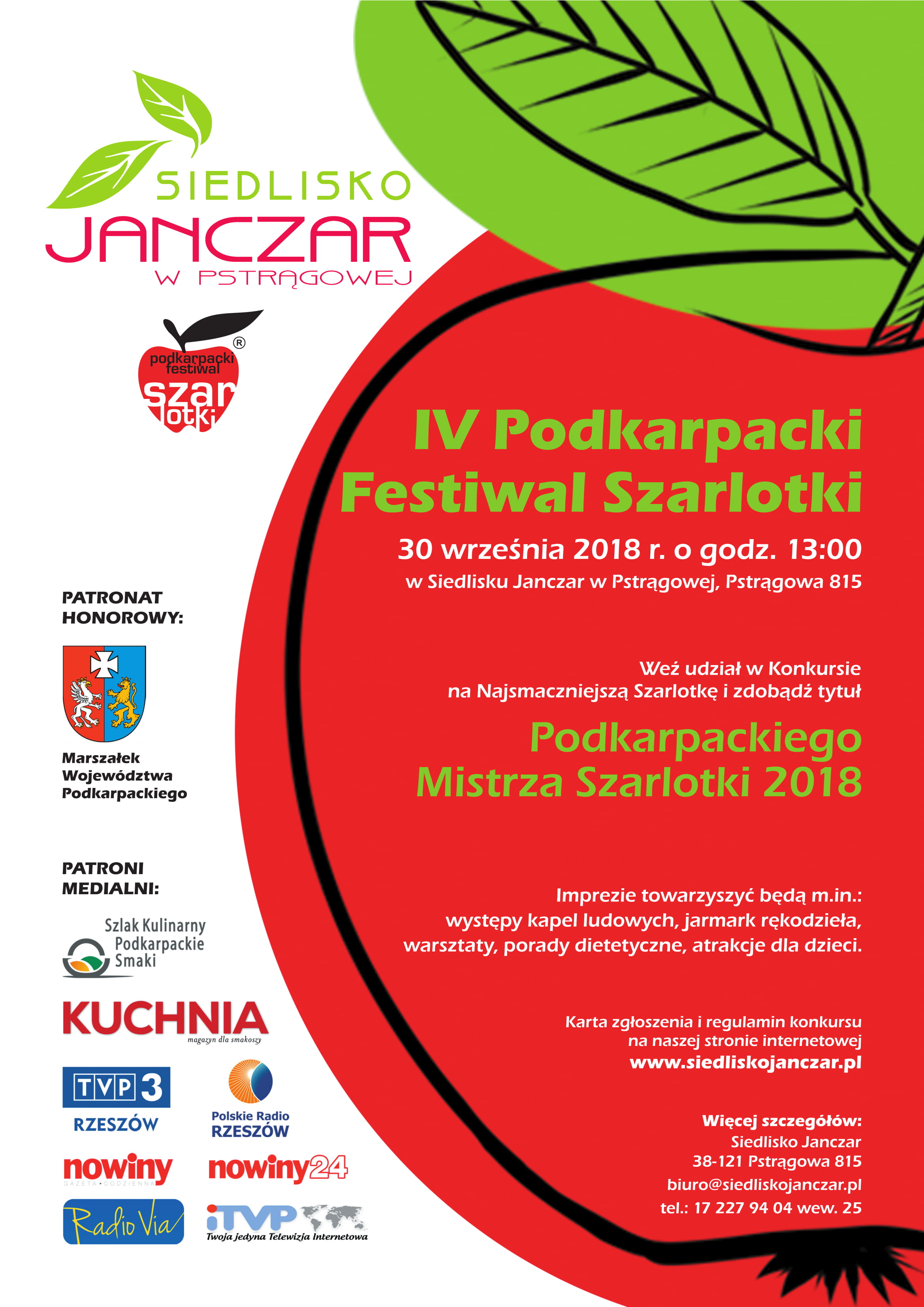Zapraszamy lokalnych Twórców, Wystawców, Koła Gospodyń Wiejskich i wszystkich zainteresowanych do udziału w IV Podkarpackim Festiwalu Szarlotki, który odbędzie się 30 września 2018 r. od godz. 13.00 w Siedlisku Janczar w Pstrągowej i objęty został patronatem Marszałka Województwa Podkarpackiego.